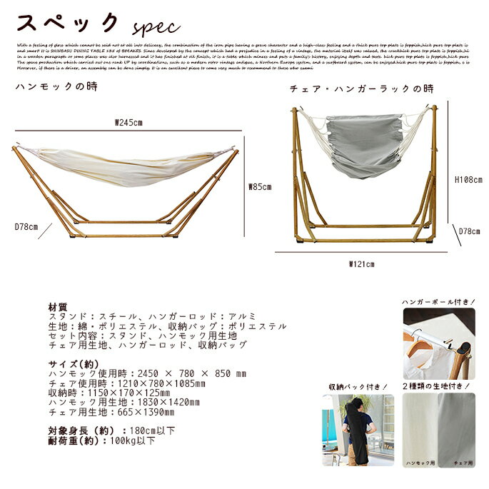 サイズ 2450 × 780 × 850 mm 材質 スタンド:スチール、ハンガーロッド:アルミ、ハンモック用生地・チェア用生地:綿・ポリエステル、収納バッグ:ポリエステル 納期 5日から10日程度 その他 3wayでお使い頂けます。