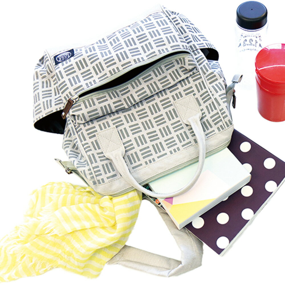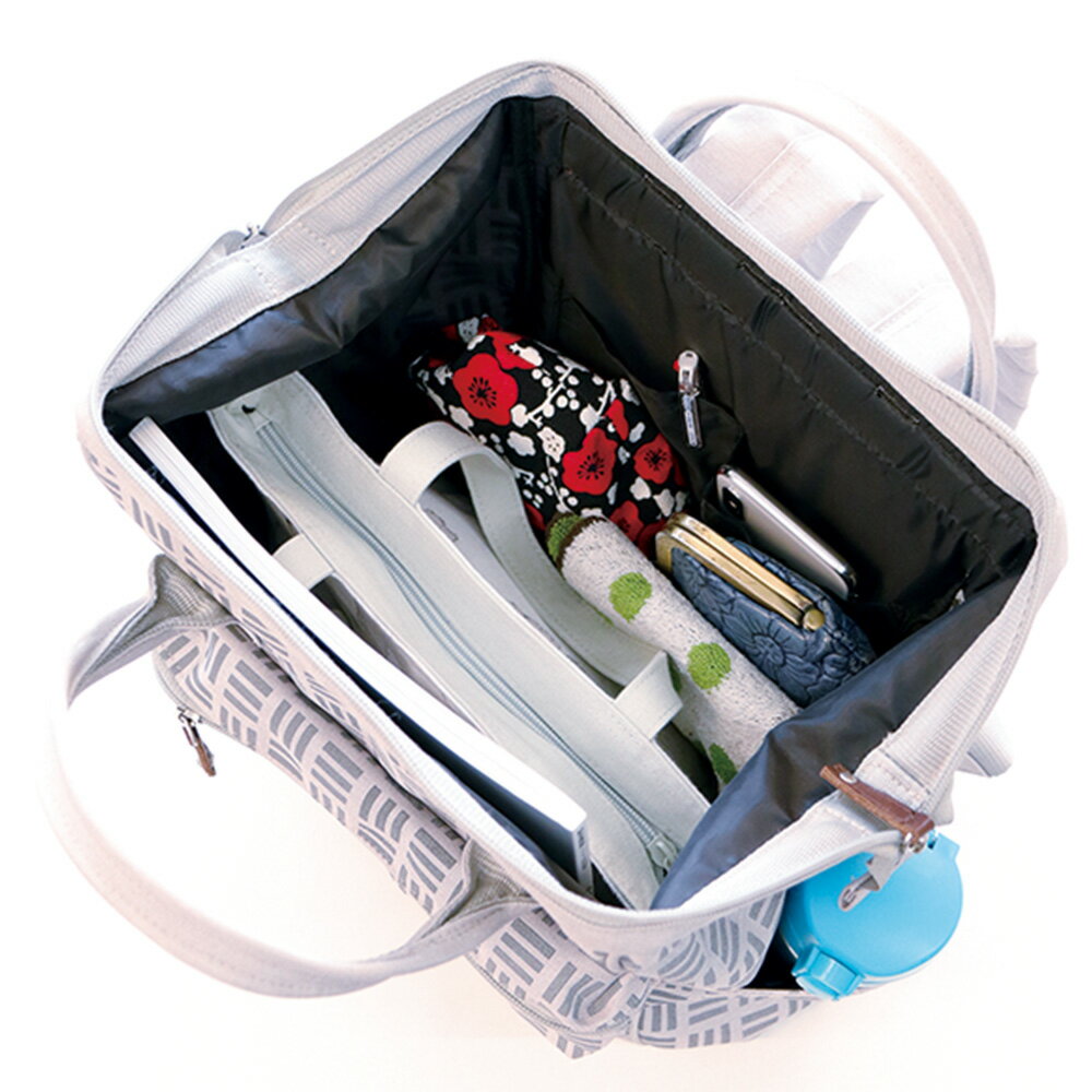 後ろからもジッパーを開いて物の出し入れがしやすく、 前とサイドにポケットがついているので、すぐに出したい鍵やペットボトル・水筒を入れられて高機能! マチが15cmとたっぷりあるので、お弁当を入れたり雑誌を入れても崩れずに安心! 文様の部分は暗闇で光を反射するリフレクター印刷を用いているので、夜道も安心! 街歩きやママバッグとして、自転車通勤のお供として。