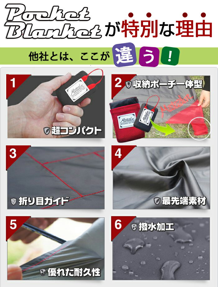 レジャーシート2人用:70×110cmで、収納時はたった5×7.5cm レジャーシート4人用:110×160cmで、収納時はたった7.5×11cm 新たにペグが収納されました!【4人用のみ】 最新のレビューをご紹介!! 商品名 Matador Pocket Blanket Version2【4人掛け】 Matador Mini Pocket Blanket Version2【2人掛け】 商品番号 S0035 S0035-2 セット内容 本体、取扱説明書 素材 タフテックス(新開発高密度ナイロン) サイズ 収納時:11×7.5cm 使用時:160×110cm 収納時:7.5×5cm 使用時:110×70cm 重さ 98g 37g 厚さ 0.09mm
